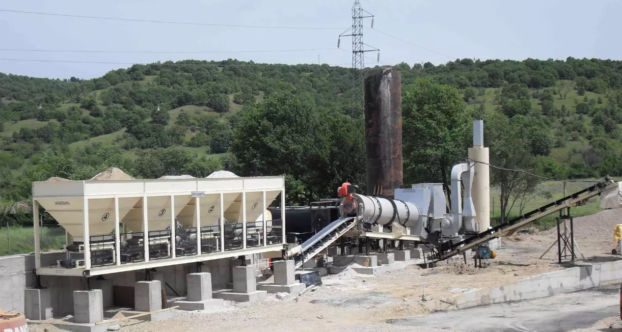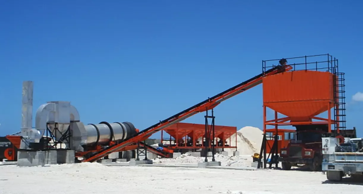 A slinger conveyor is provided which receives aggregate from the four bin feeder and feeds it to the dryer drum.