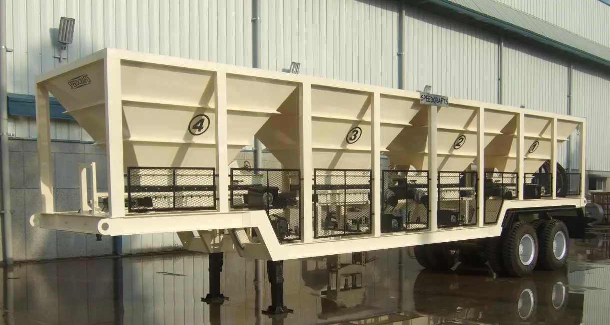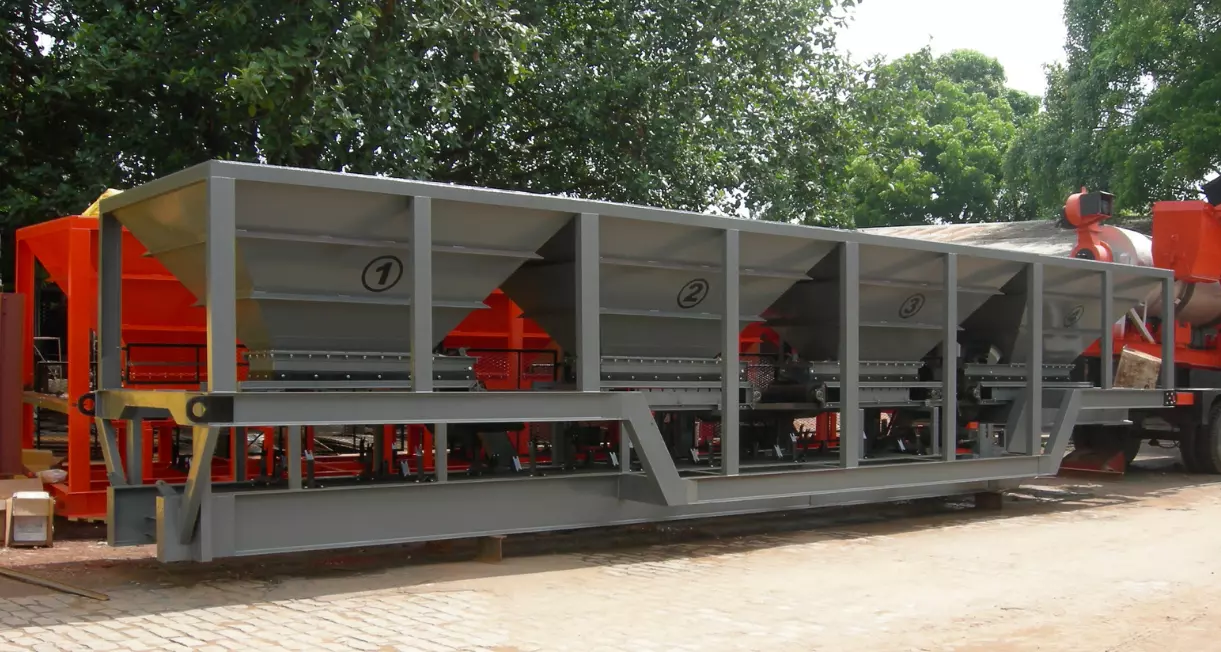 It is of single chassis construction. At each Bin, a radial gate is provided which can be opened in any position to regulate the aggregate flow. Individual endless belts fitted with variable speed motors discharges material onto the gathering conveyor as per the mix design.